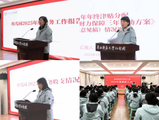 会议听取并审议了多项重要报告与方案。张璐璐副园长就《幼儿园增强财力保障三年行动方案(征求意见稿)》及2025年年终津贴分配情况作了说明;高东慧副园长汇报了幼儿园2025年度“三重一大”事项执行情况及财务收支状况;戴薇老师介绍了本次大会提案征集的相关情况。