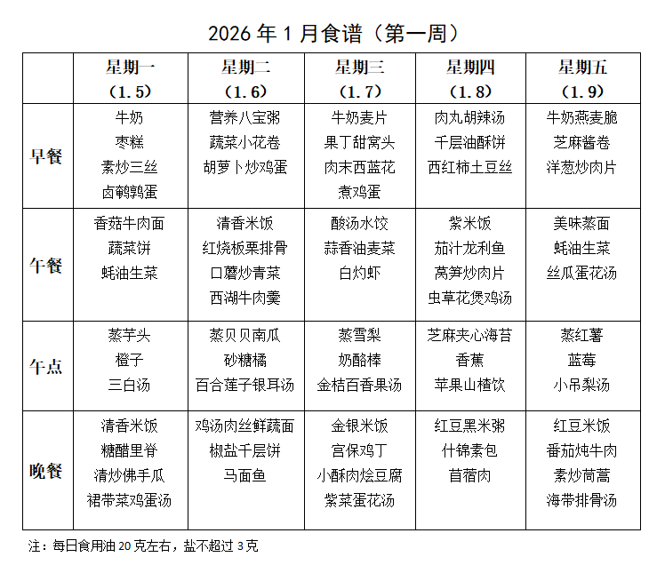 陕西师范大学幼儿园2026年1月份第一周食谱